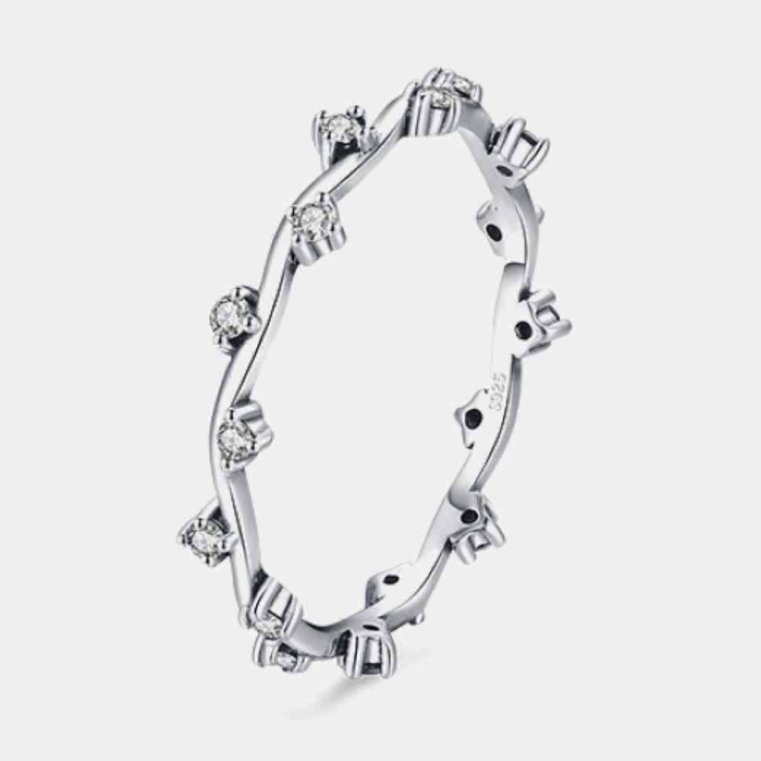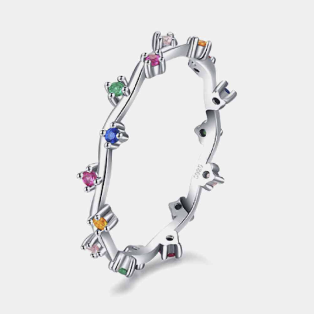 - Dazzle your digits with our Sterling Silver Zircon Ring, featuring spaced out zircons staggered on each side. Choose between classic white zircons for timeless elegance or opt for a playful twist with multi-color zircons. Either way, elevate your ring collection with this eye-catching and versatile piece.