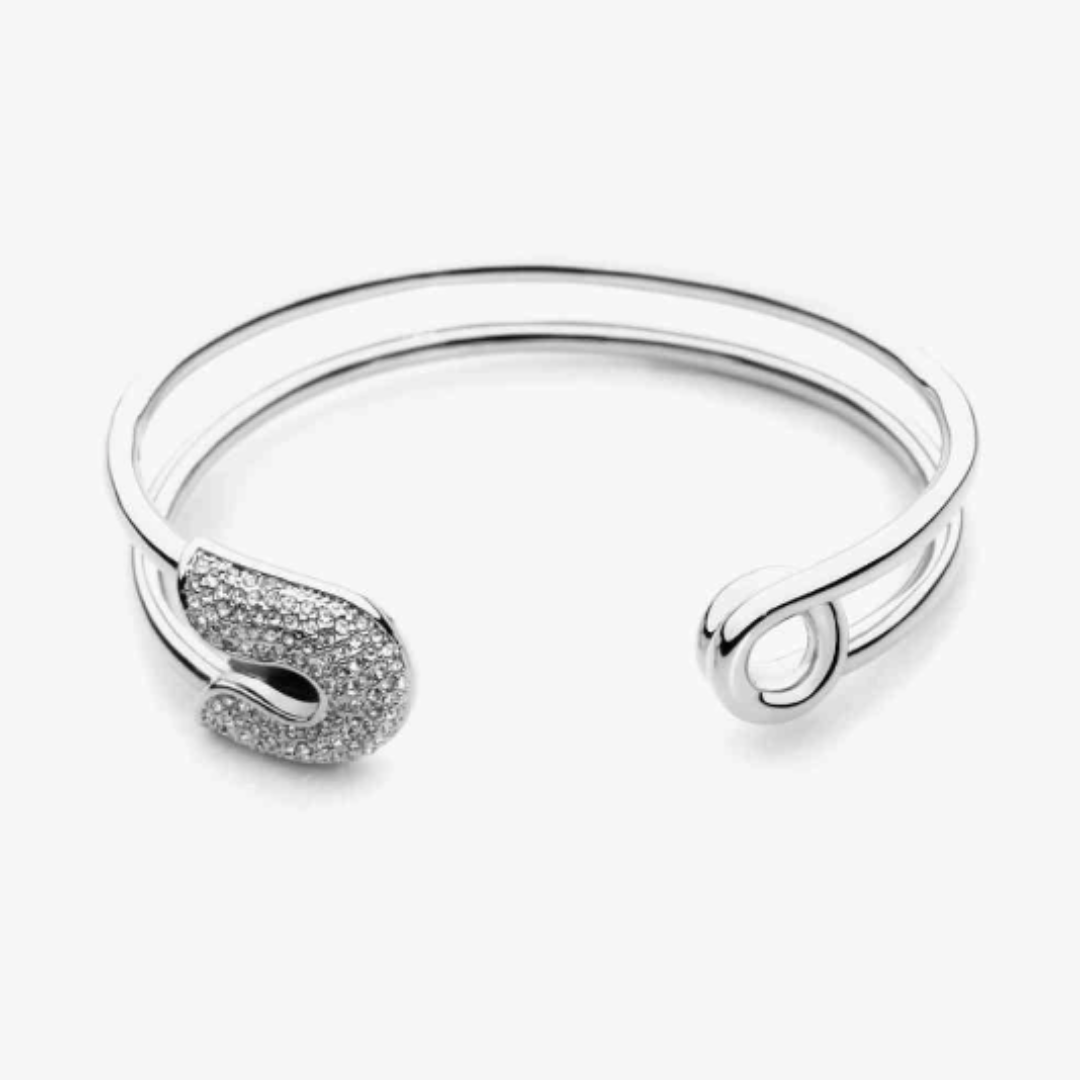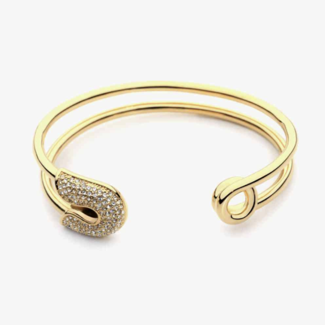 Adorn your wrist with a touch of glamour in our Rhinestone Double Hoop Bracelet. This unique piece, available in gold or silver, features a large safety pin embellished with dazzling rhinestones. This piece adds edgy charm to your collection, perfect for making a statement.