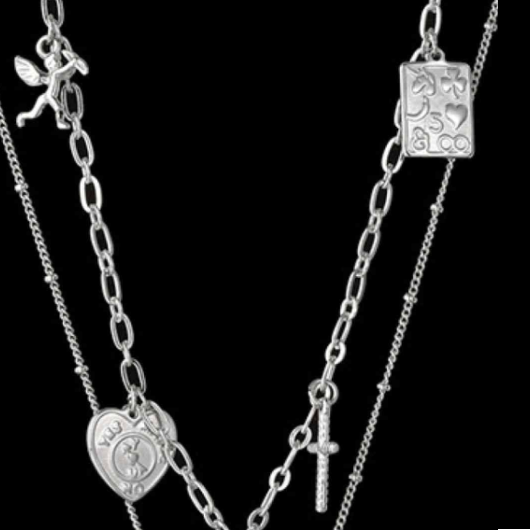 - Adorn yourself in elegance with our Double Stacked Cross and Charms Layered Necklace. The longer cross pendant, featuring a captivating design, hangs gracefully on a satellite chain. It accompanies a shorter cable chain showcasing charming accents. This layered design combines sophistication with playful charm, creating a versatile and stylish accessory.