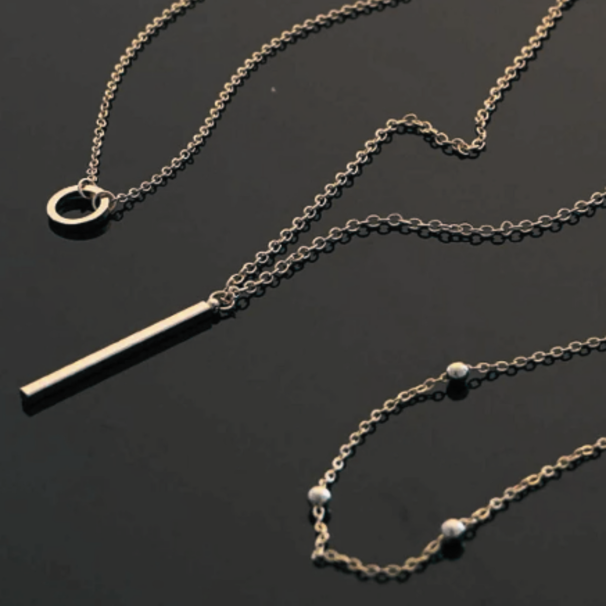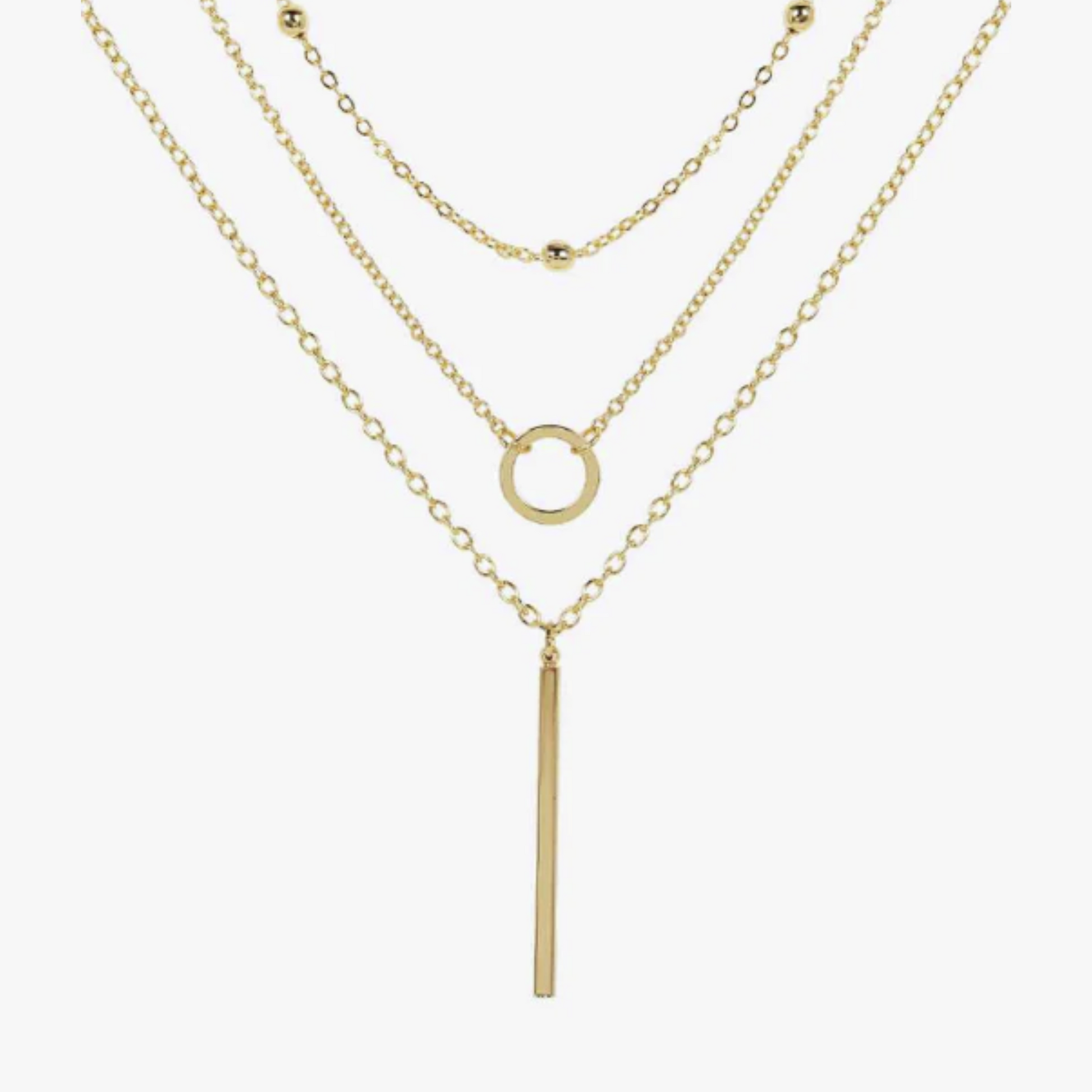 - Three piece Geometric circle, bar, and satellite chain fashion jewelry. Easy layering for elegance and beauty.